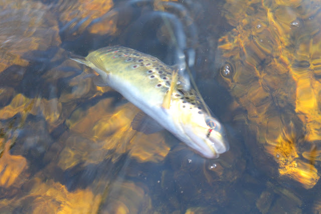 I gradually worked my way along the bank and with some good advice from my dad continued to work the drop off ...... then the line tightened and i was into another perfectly marked wild brown trout.